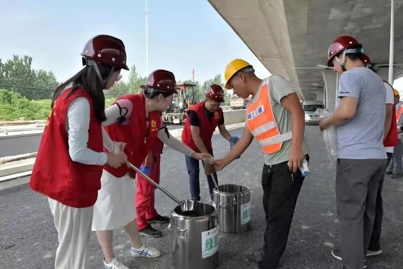 吃,一天三顿都是四菜一汤,尽量顿顿不重样。一线建设人员忙的时候,早餐、中餐、晚餐以及夜宵,顿顿用饭盒装好,送到工人手中。冬天,工人顶着寒风施工,他们主动送去姜汤;夏天酷暑难熬,又送去绿豆汤、矿泉水。