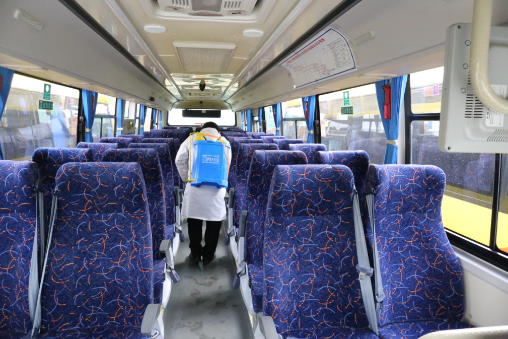 严把车辆消毒关。对车辆进行全方位的消毒和清洁,为每台车配备喷壶和消毒水,要求驾驶员做到一天两消毒,力求做到疫情防控零死角、零盲区,座椅、地板、车窗等乘客接触频繁的位置进行重点消毒。