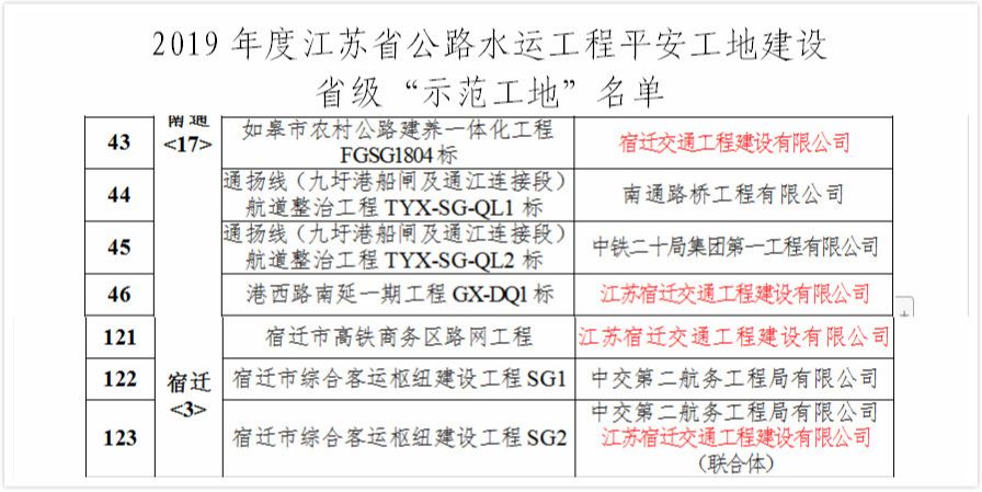 根据江苏省交通运输厅2019年度全省公路水运工程平安工地建设省级“示范工地”公示的名单,宿迁交建承建的市高铁商务区路网工程、市综合客运枢纽建设工程SG2工程、港西路南延一期工程GX-DQ1标、如皋市农村公路建养一体化工程FGSG1804标四个工程项目荣获省级平安工地“示范工地”称号。