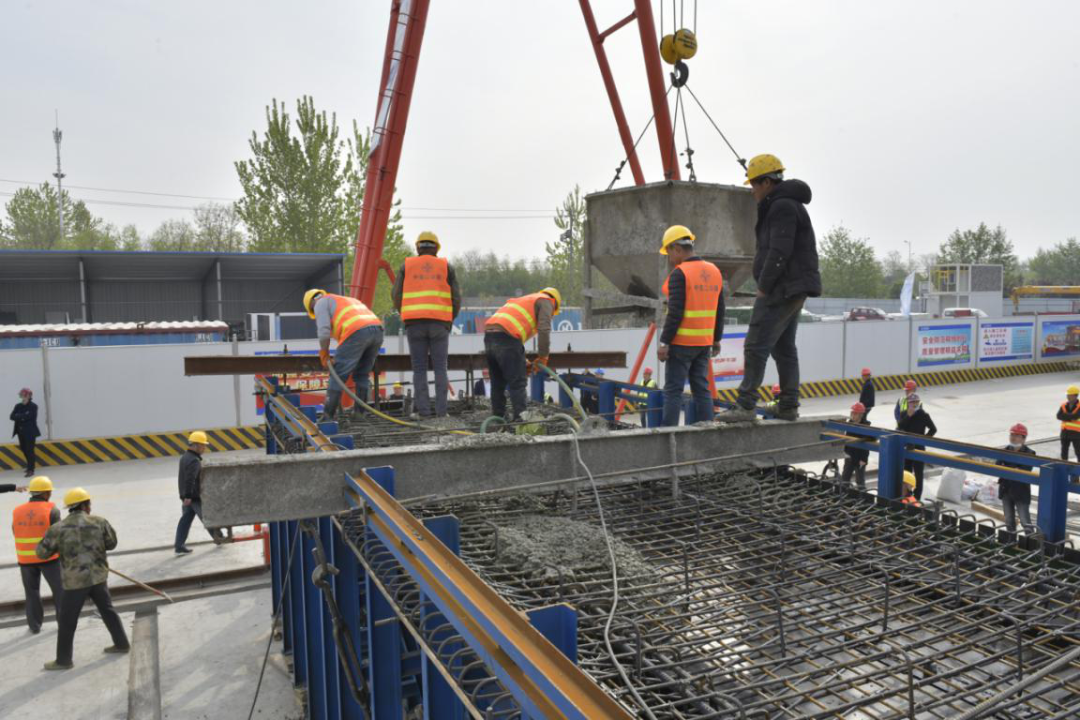 4月14日上午8时18分,宿迁市上海路(高铁站连接线)改造二期工程项目开始首片预制箱梁浇筑,经过多个小时努力,当日15时15分成功浇筑完成。首片预制箱梁的成功浇筑,标志着民便河、古黄河两座地面桥全面开始上部结构施工,为实现年底主线通车打下了良好技术基础。
