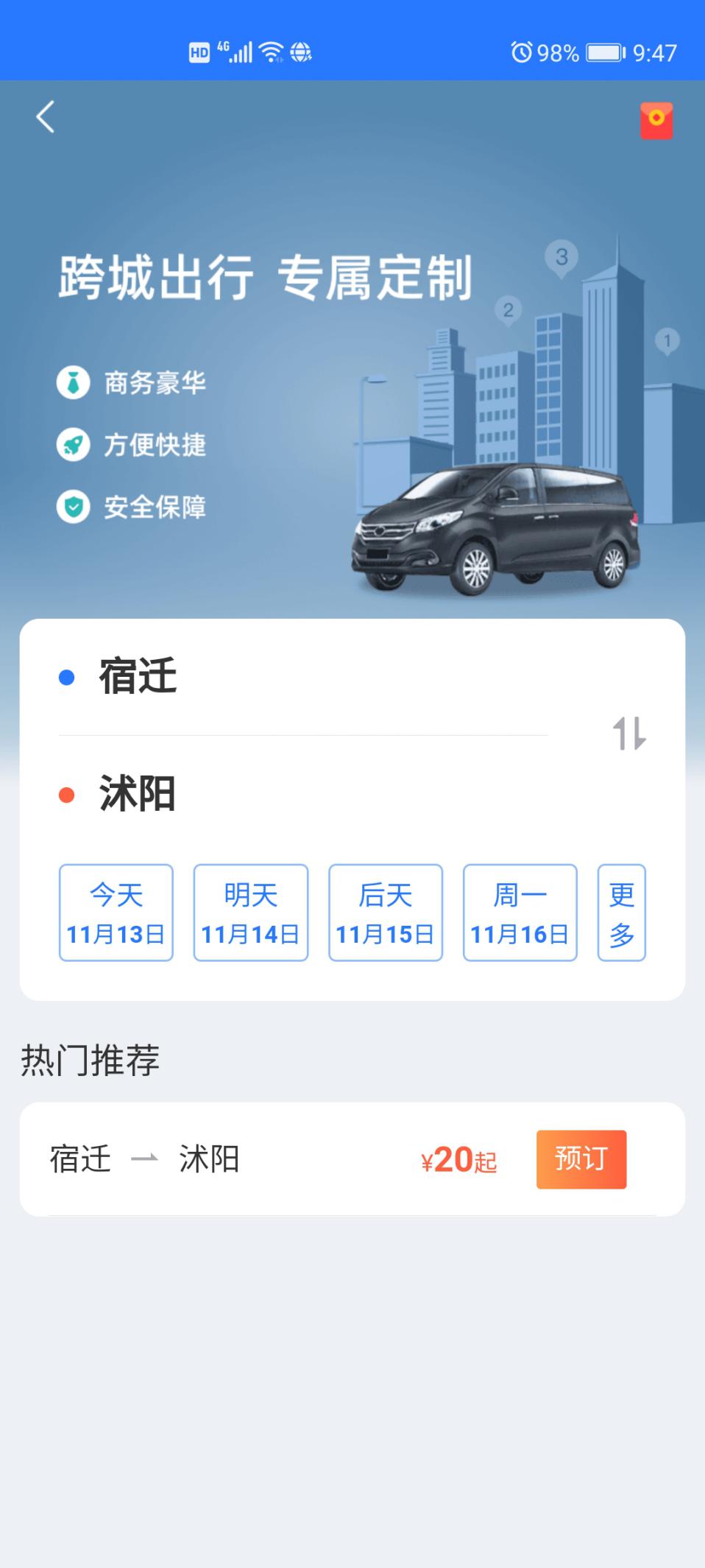 步骤二:选择出发到达城市,例如:“宿迁-沭阳”;