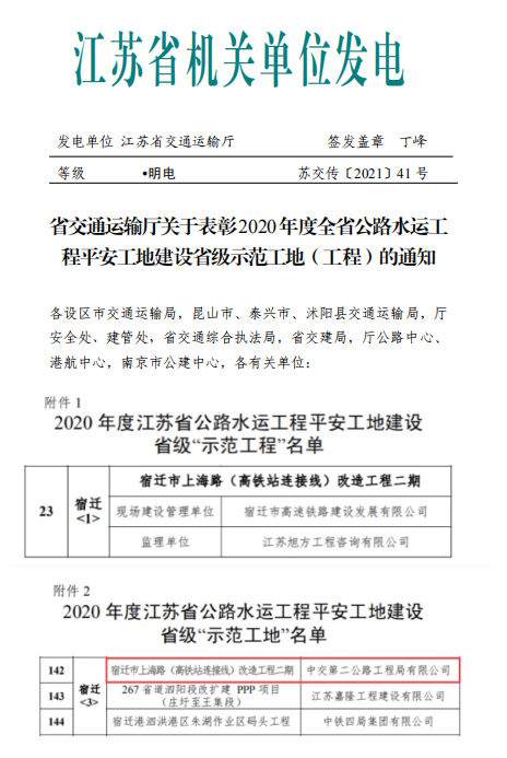近日,江苏省交通运输厅公布了2020年度全省公路水运工程平安工地建设省级“示范工地(工程)”名单,由高铁公司承建的上海路(高铁站连接线)改造工程二期光荣上榜。至此,市综合客运枢纽工程、市高铁商务区市政配套工程等该公司所有承建项目均获得平安工地“示范工地”称号。