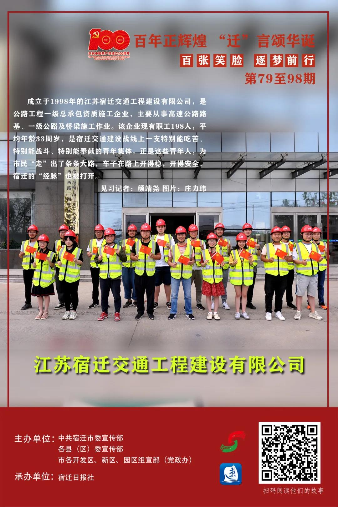 成立于1998年的江苏宿迁交通工程建设有限公司,是公路工程一级总承包资质施工企业,主要从事高速公路路基、一级公路及桥梁施工作业。该企业现有职工198人,平均年龄33周岁,是宿迁交通建设战线上一支特别能吃苦、特别能战斗、特别能奉献的青年集体。正是这些青年人,为市民“走”出了条条大路,车子在路上开得稳,开得安全,宿迁的“经脉”也被打开。