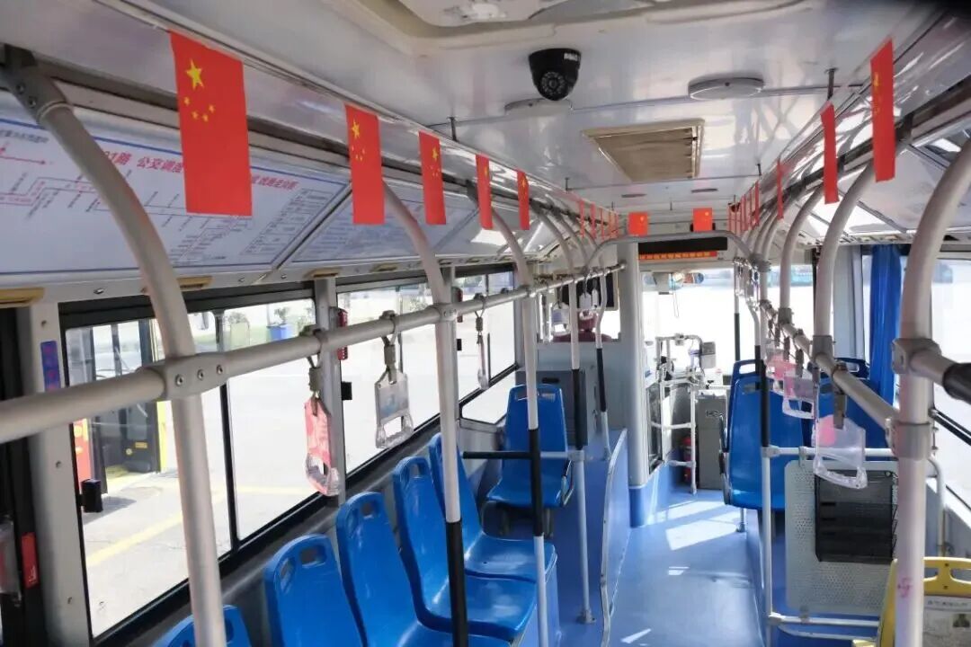 节日的车厢里,处处洋溢着浓厚的喜庆氛围。301路公交车厢内,车顶两侧整齐悬挂着鲜艳的五星红旗,微风拂过,红旗轻轻摇曳,乘客们刚踏上车厢,目光便被这抹亮眼的中国红吸引,孩子们指着红旗兴奋地向家长提问,车厢内满是欢声笑语,节日的幸福感在流动中不断传递。