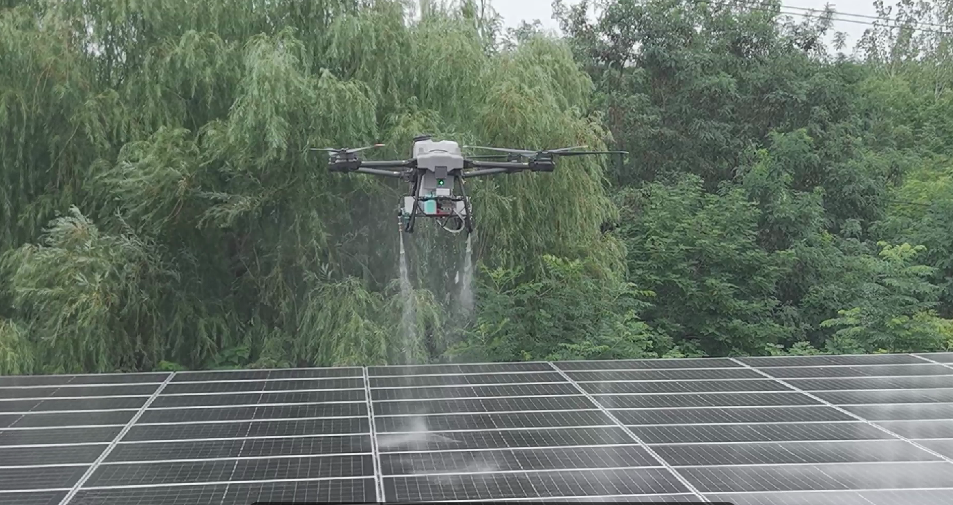 在光伏电站,无人机则变身“清洁能手”,开展光伏板清洗作业。它能够精准定位光伏板上的污垢和灰尘,随后配合高压水枪与特制清洁液,高效且安全地完成清洗任务。