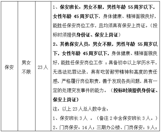 1.原采购文件 第四部分 采购需求 三、服务岗位人员配置、服务要求:保安人员要求更正为以下内容: